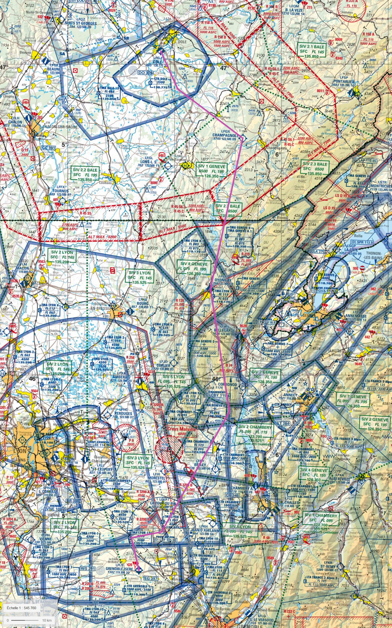 Après échange avec ATC, voilà ce qu'il est bien de faire pour ne pas venir percuter l'espace Suisse : respecter le 1000 ft ASFC (1000 ft surface pour rester SOUS la zone de contrôle, la classe C, celle imposant d'avoir une clairance de la TMA Genève. En fait rester sous 5500 QNH (niveau mer) de la classe C. Et rester "conventionnellement" avec Lyon APP, qui nous suivra en mode SIV en qq sorte. En pratique c'est le SIV de Genève mais pour cette occasion, il y a une entente entre les ATC des 2 pays :-)