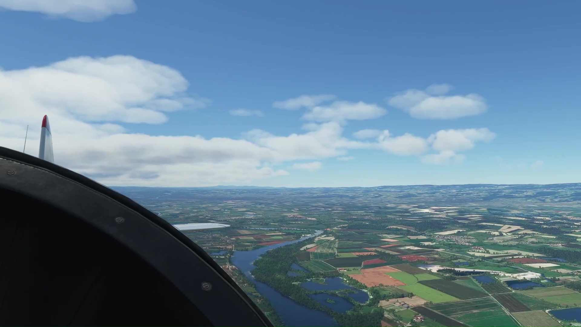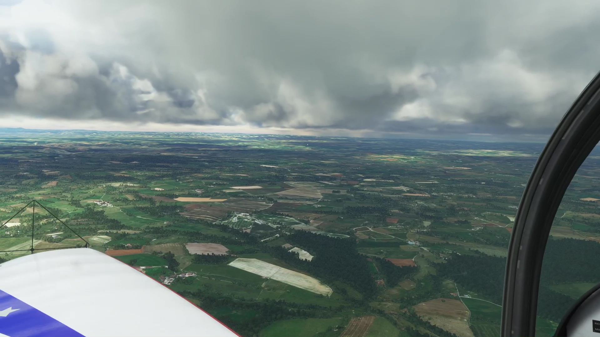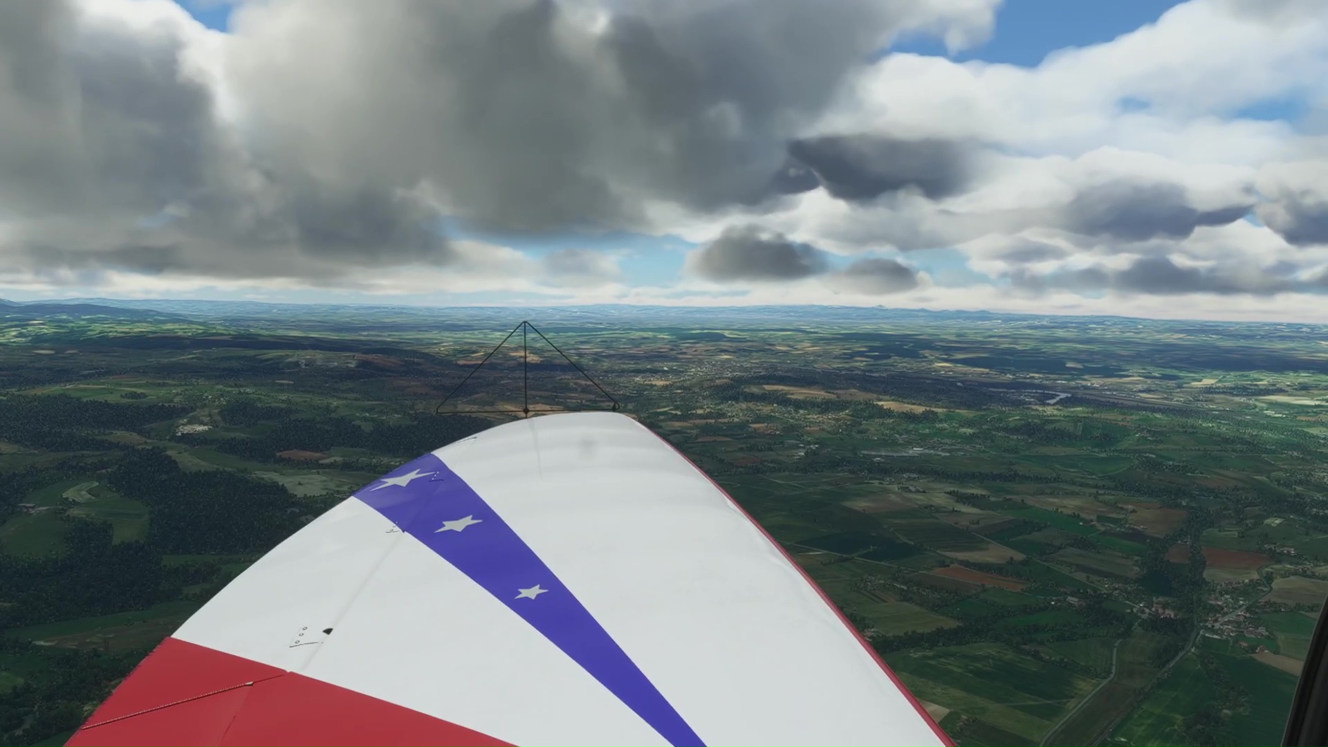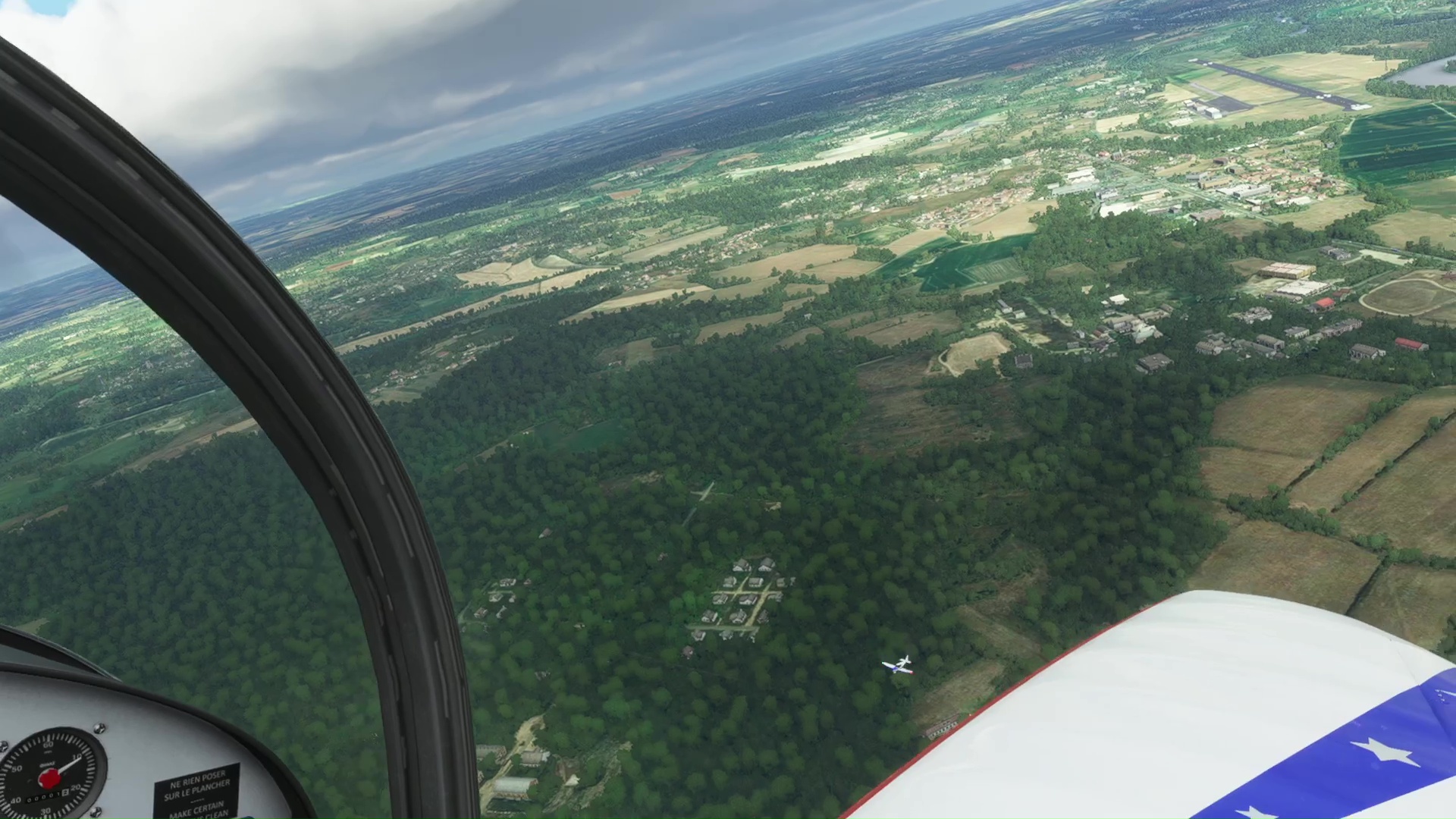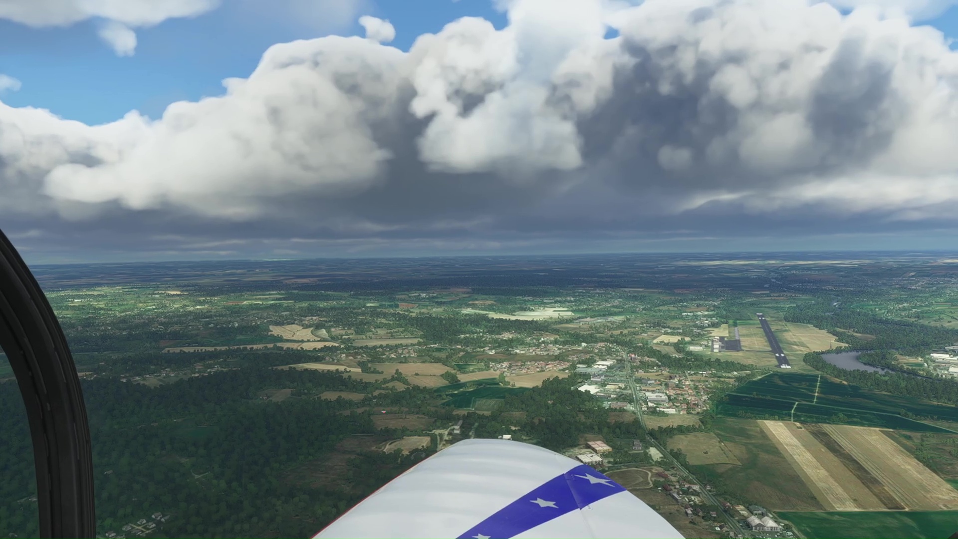 La météo a été très bonne sur les 2/3 ou 3/4 du vol, le reste s'est fait sous une imposante couche nuageuse, compliquant de fait un peu la reconnaissance au sol : pas facile de voir une ville dans l'ombre (il faudra voir à améliorer la texture des nuages tout de même). Et comme je me suis "égaré" (après un passage en drone) le jeu n'était que plus drôle. L'occasion de découvrir un autre piège : les feux fixes, peuvent ne pas venir d'un avion en vol. Cela n'a prêté trop à conséquence, mais cela m'a un peu berné aussi.