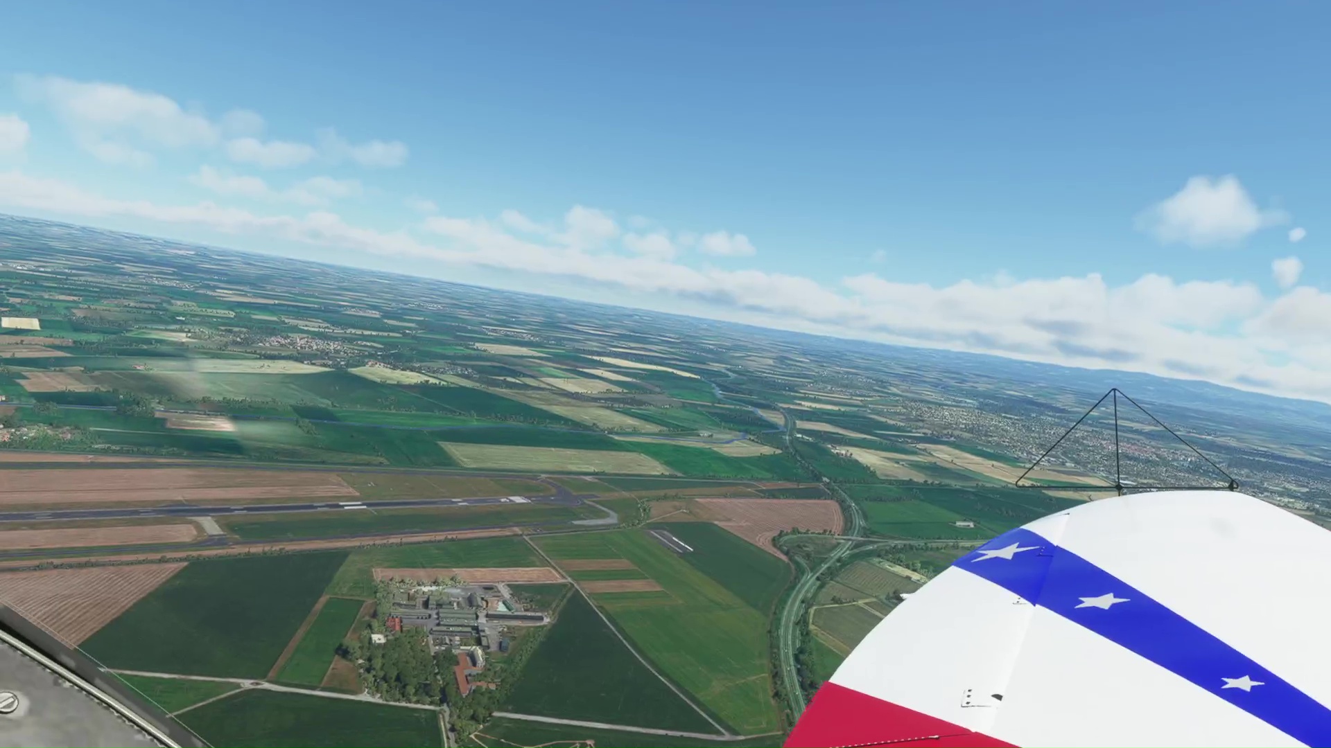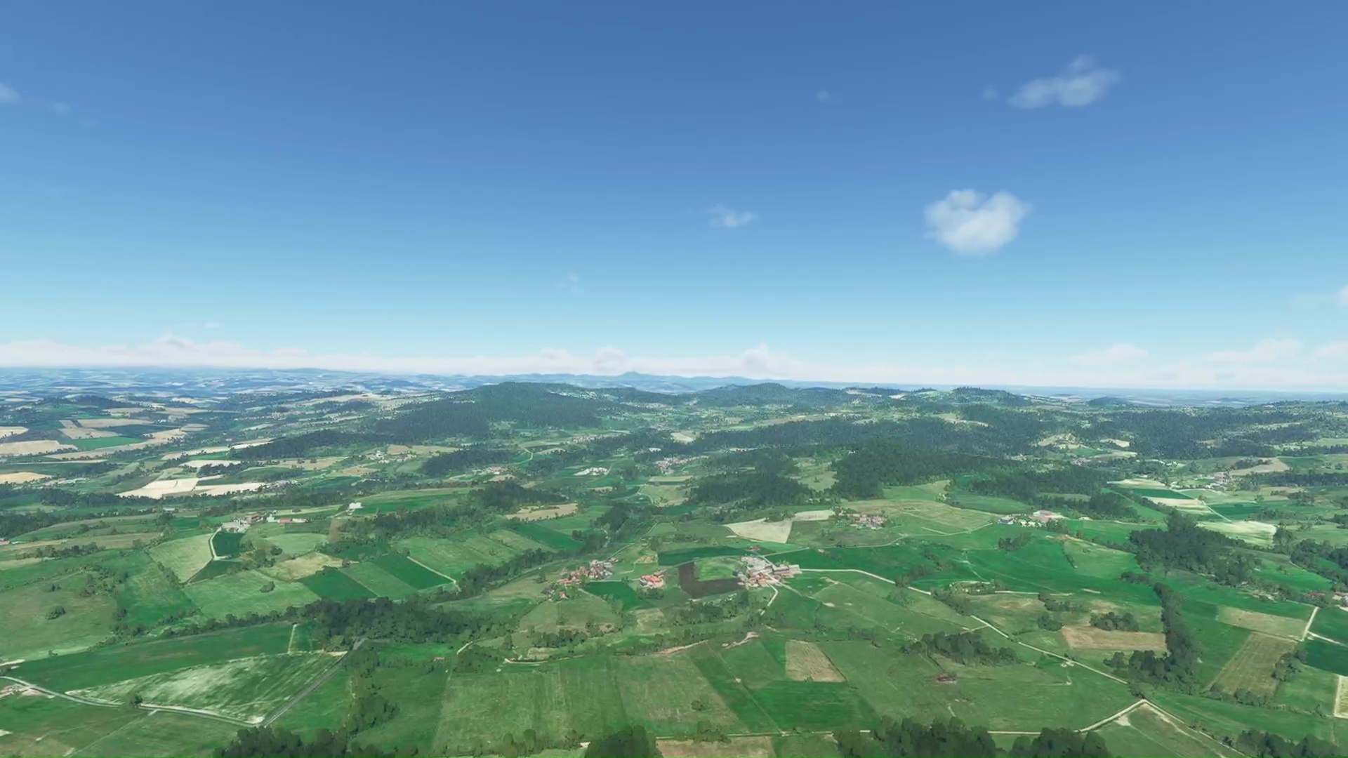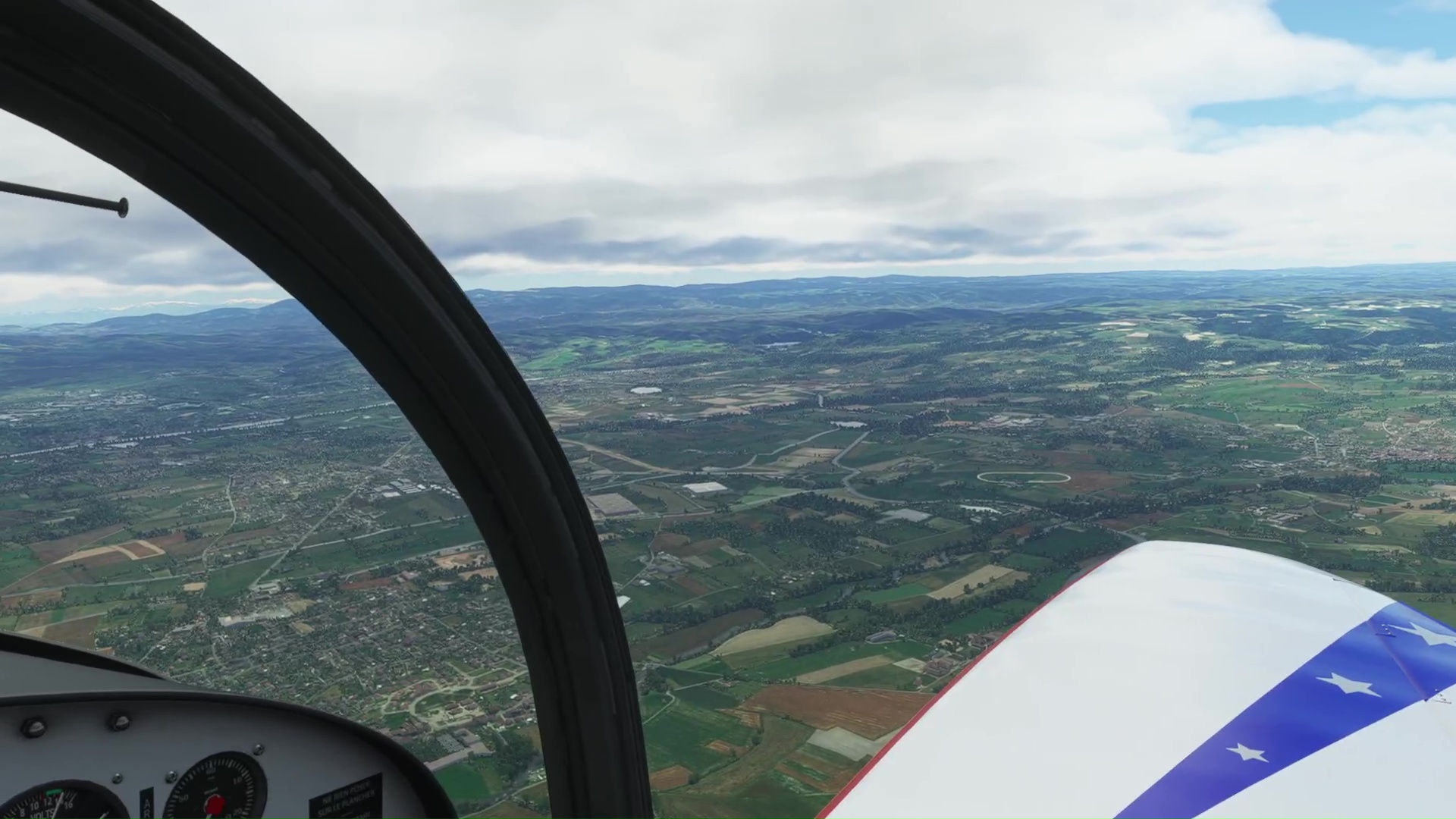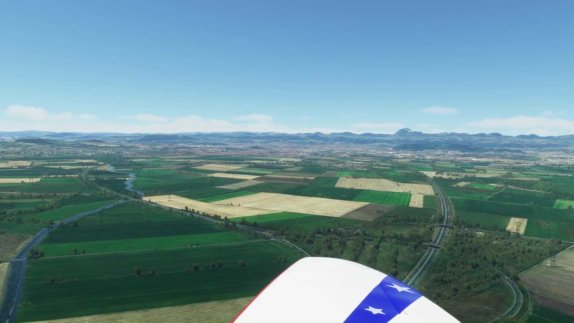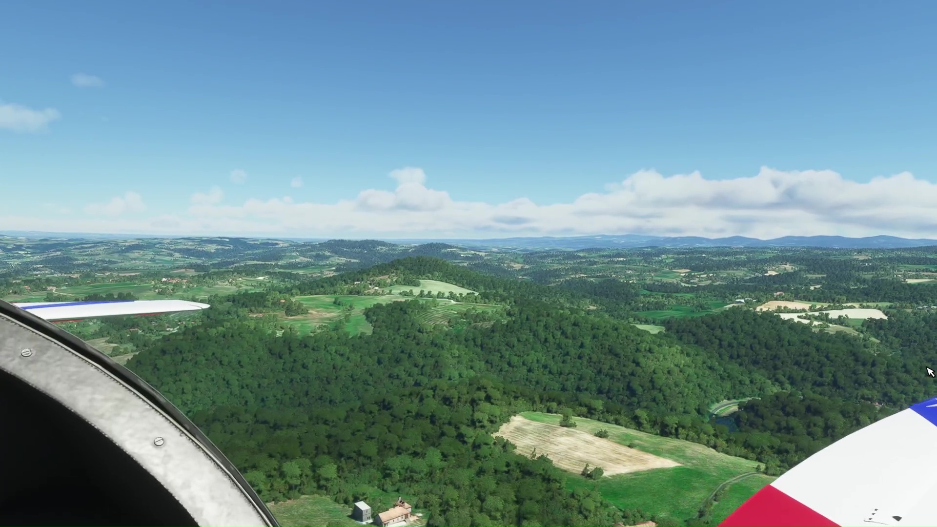 La météo a été très bonne sur les 2/3 ou 3/4 du vol, le reste s'est fait sous une imposante couche nuageuse, compliquant de fait un peu la reconnaissance au sol : pas facile de voir une ville dans l'ombre (il faudra voir à améliorer la texture des nuages tout de même). Et comme je me suis "égaré" (après un passage en drone) le jeu n'était que plus drôle. L'occasion de découvrir un autre piège : les feux fixes, peuvent ne pas venir d'un avion en vol. Cela n'a prêté trop à conséquence, mais cela m'a un peu berné aussi.